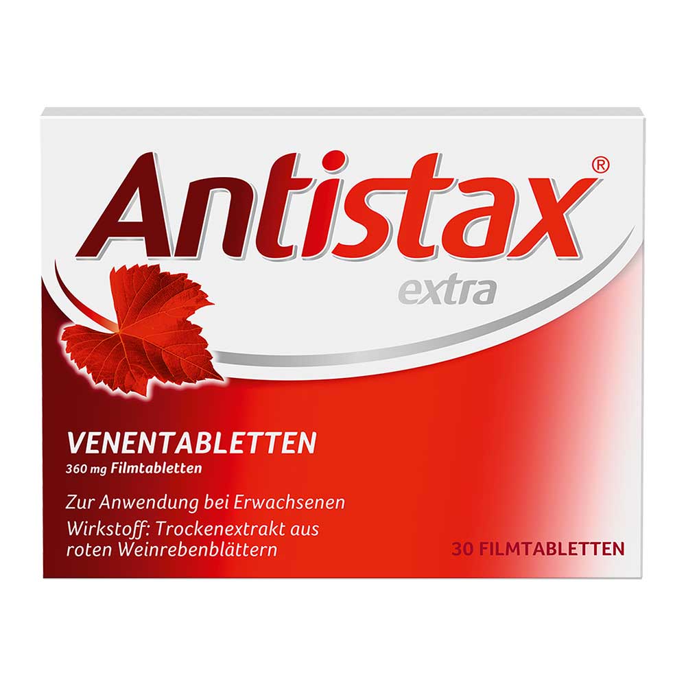 Antistax® extra Venentabletten. 360 mg Filmtabletten Zur Anwendung bei Erwachsenen Wirkstoff: Trockenextrakt aus roten Weinrebenblättern. Zur Behandlung von Beschwerden bei Erkrankungen der Beinvenen (chronische Veneninsuffizienz), die sich zum Beispiel durch Schmerzen und Schweregefühl in den Beinen, Krampfadern, nächtliche Wadenkrämpfe, Juckreiz und geschwollene Beine (Beinödeme) äußern. Zu Risiken und Nebenwirkungen lesen Sie die Packungsbeilage und fragen Sie Ihre Ärztin, Ihren Arzt oder in Ihrer Apotheke. STADA Consumer Health Deutschland GmbH, Stadastraße 2–18, 61118 Bad Vilbel Stand: Oktober 2023