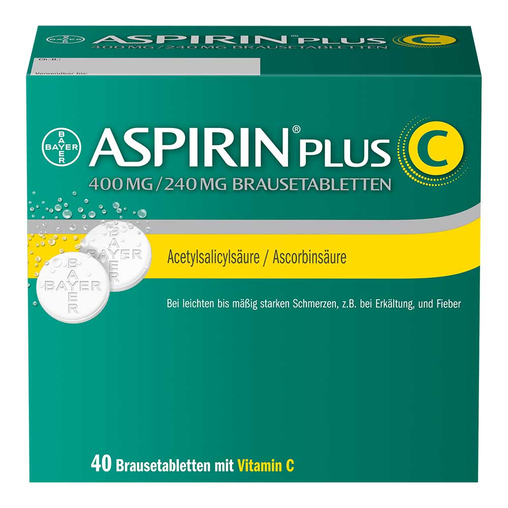 Aspirin® Plus C Wirkstoffe: Acetylsalicylsäure, Ascorbinsäure (Vitamin C) Anwendungsgebiete: Leichte bis mäßig starke Schmerzen wie Kopfschmerzen; Zahnschmerzen; Regelschmerzen; schmerzhafte Beschwerden, die im Rahmen von Erkältungskrankheiten auftreten (z. B. Kopf-, Hals- und Gliederschmerzen); Fieber. Bitte beachten Sie die Angaben für Kinder. Hinweis: Enthält Natriumverbindungen. Packungsbeilage beachten. Bei Schmerzen oder Fieber ohne ärztlichen Rat nicht länger anwenden als in der Packungsbeilage vorgegeben! Zu Risiken und Nebenwirkungen lesen Sie die Packungsbeilage und fragen Sie Ihre Ärztin, Ihren Arzt oder in Ihrer Apotheke.