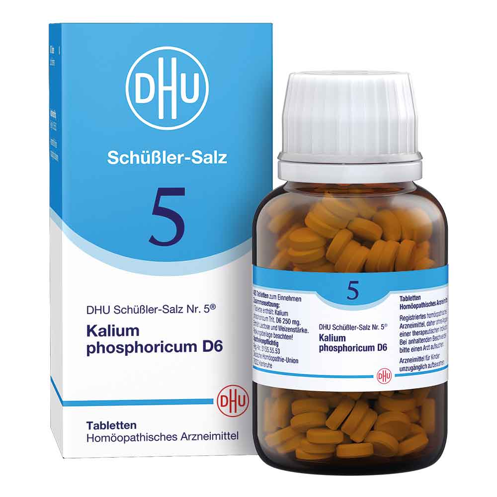 DHU Schüßler-Salz Nr. 5® Kalium phosphoricum D6 Anwendungsgebiete: Registriertes homöopathisches Arzneimittel, daher ohne Angabe einer therapeutischen Indikation. Zu Risiken und Nebenwirkungen lesen Sie die Packungsbeilage und fragen Sie Ihre Ärztin, Ihren Arzt oder in Ihrer Apotheke. Enthält Lactose und Weizenstärke. Packungsbeilage beachten! Deutsche Homöopathie-Union DHU-Arzneimittel GmbH & Co. KG, Karlsruhe