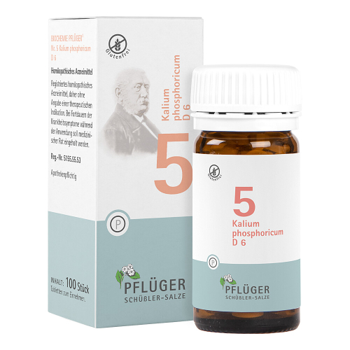 Biochemie Pflüger® Nr. 5 Kalium phosphoricum D 6 , Zusammensetzung: 1 Tablette enthält: Wirkstoff: Kalium phosphoricum D 6 250 mg. Sonstige Bestandteile: Calciumbehenat (DAB), Kartoffelstärke. Registriertes homöopathisches Arzneimittel, daher ohne Angabe einer therapeutischen Indikation. Gegenanzeigen/Nebenwirkungen: keine bekannt. Enthält Lactose. Packungsbeilage beachten. Zu Risiken und Nebenwirkungen lesen Sie die Packungsbeilage und fragen Sie Ihre Ärztin, Ihren Arzt oder in Ihrer Apotheke. Homöopathisches Laboratorium Alexander Pflüger GmbH & Co. KG, 33378 Rheda-Wiedenbrück | info@pflueger.de | www.pflueger.de