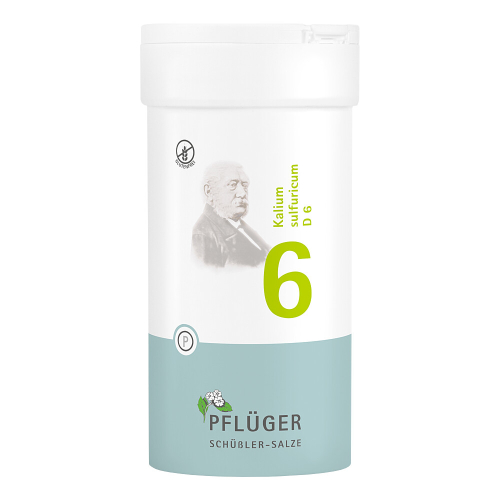Biochemie Pflüger® Nr. 6 Kalium sulfuricum D 6, Zusammensetzung: 1 Tablette enthält: Wirkstoff: Kalium sulfuricum D 6 250 mg. Sonstige Bestandteile: Calciumbehenat (DAB), Kartoffelstärke. Registriertes homöopathisches Arzneimittel, daher ohne Angabe einer therapeutischen Indikation. Gegenanzeigen/Nebenwirkungen: keine bekannt. Enthält Lactose. Packungsbeilage beachten. Zu Risiken und Nebenwirkungen lesen Sie die Packungsbeilage und fragen Sie Ihre Ärztin, Ihren Arzt oder in Ihrer Apotheke. Homöopathisches Laboratorium Alexander Pflüger GmbH & Co. KG, 33378 Rheda-Wiedenbrück | info@pflueger.de | www.pflueger.de