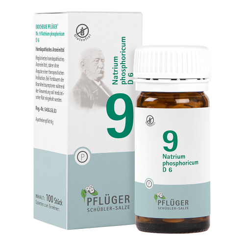 Biochemie Pflüger® Nr. 9 Natrium phosphoricum D 6 , Zusammensetzung: 1 Tablette enthält: Wirkstoff: Natrium phosphoricum Trit. D 6 250 mg. Sonstige Bestandteile: Calciumbehenat (DAB), Kartoffelstärke. Registriertes homöopathisches Arzneimittel, daher ohne Angabe einer therapeutischen Indikation. Gegenanzeigen/Nebenwirkungen: keine bekannt. Enthält Lactose. Packungsbeilage beachten. Zu Risiken und Nebenwirkungen lesen Sie die Packungsbeilage und fragen Sie Ihre Ärztin, Ihren Arzt oder in Ihrer Apotheke. Homöopathisches Laboratorium Alexander Pflüger GmbH & Co. KG, 33378 Rheda-Wiedenbrück | info@pflueger.de | www.pflueger.de