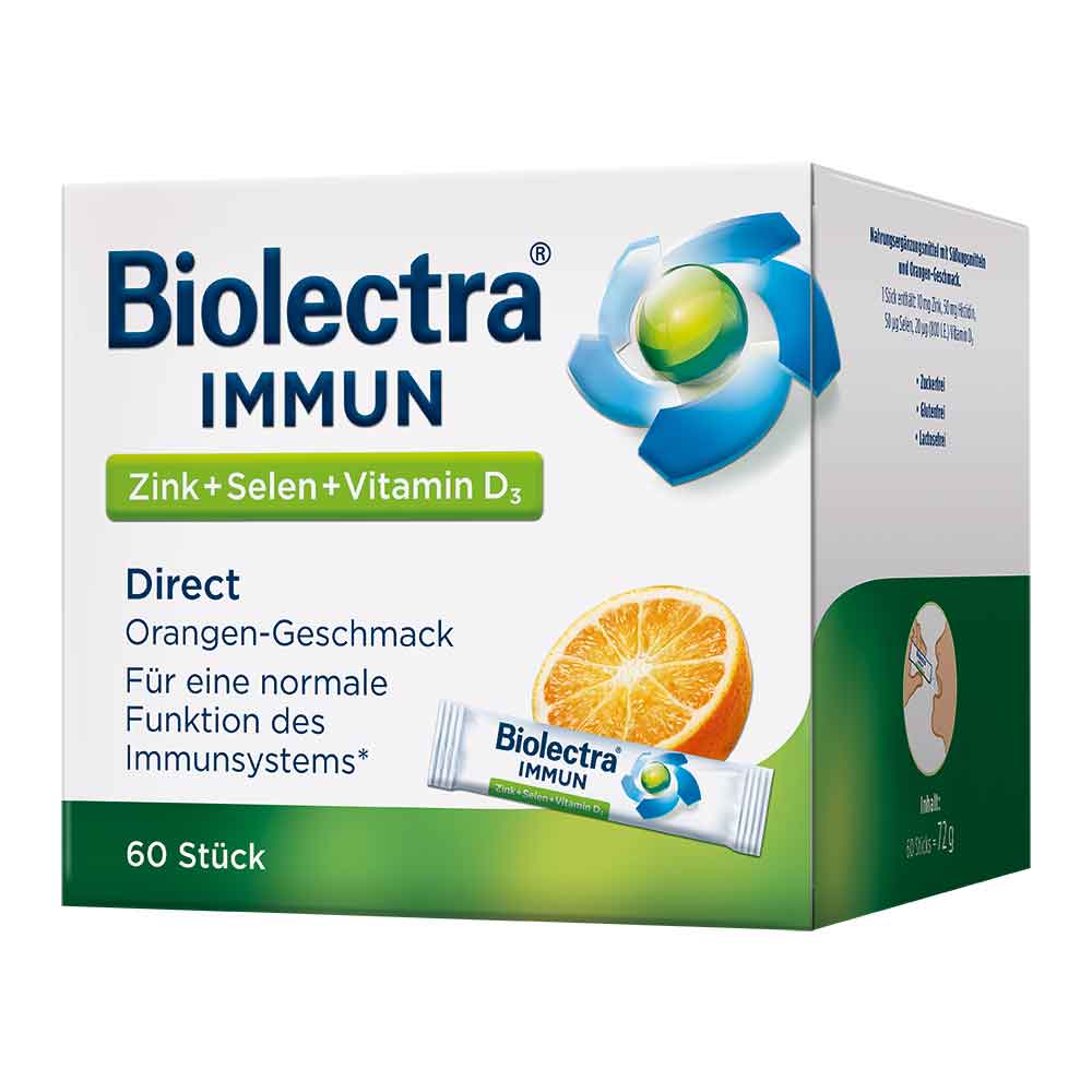 Eine ausreichende Versorgung mit Zink, Selen und Vitamin D3 ist ein entscheidender Faktor zur Erhaltung der Abwehrleistung des körpereigenen Immunsystems, denn Zink und Selen tragen zur normalen Funktion des Immunsystems bei. Dank der besonderen Darreichungsform Micro-Pellets kann Biolectra Immun Direct ohne Flüssigkeit eingenommen werden.