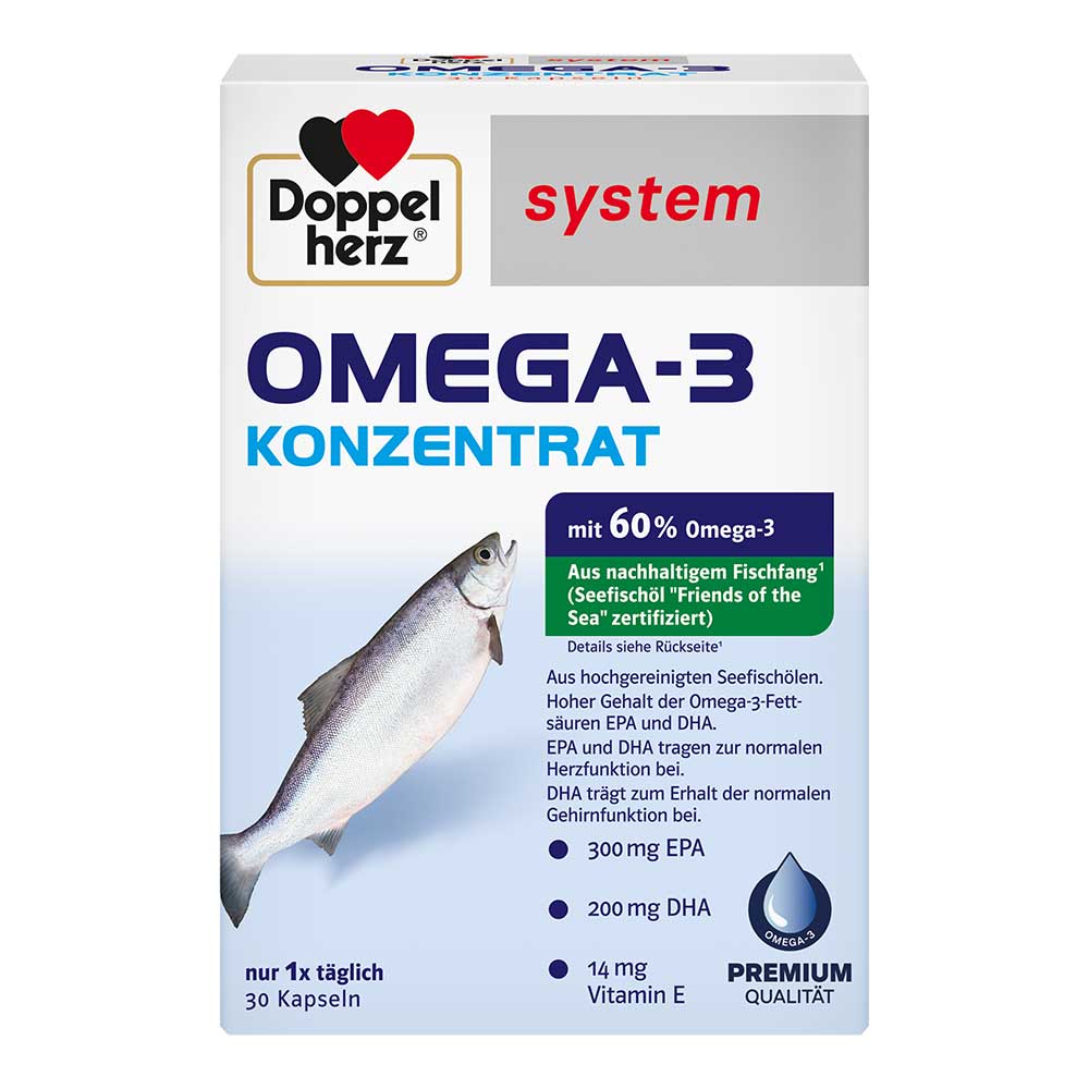 Die Doppelherz system-Kapseln enthalten 900 mg Omega-3-Konzentrat aus Seefischölen, das 60 % an Omega-3-Fettsäuren enthält. Viele andere herkömmliche Fischöle enthalten nur 30 % Omega-3-Fettsäuren. Aufgrund dieser hohen Konzentration von Omega-3-Fettsäuren verringert sich die tägliche Einnahmemenge auf nur 1 Kapsel täglich!