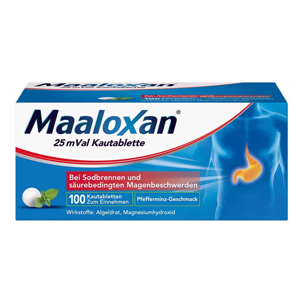 Maaloxan® 25 mVal Kautablette. Wirkstoff: Algeldrat, Magnesiumhydroxid. Anw.geb.: Zur symptomatischen Behandlung von Erkrankungen, bei denen die Magensäure gebunden werden soll: Sodbrennen und säurebedingte Magenbeschwerden, Magen- oder Zwölffingerdarmgeschwüre (Ulcus ventriculi u. Ulcus duodeni). Hinweise: Nicht bei Kindern unter 12 Jahren anwenden. Beschwerden, die länger als 2 Wochen bestehen, klinisch abklären lassen. Enthält Mannitol, Sorbitol, Sucrose (Zucker), Minzaroma. Die Einnahme anderer Arzneimittel sollte grundsätzlich mindestens 2 h vor oder nach Einnahme von Maaloxan Kautablette erfolgen. Apothekenpflichtig. Zu Risiken und Nebenwirkungen lesen Sie die Packungsbeilage und fragen Sie Ihre Ärztin, Ihren Arzt oder in Ihrer Apotheke. A. Nattermann & Cie. GmbH, Brüningstraße 50, 65929 Frankfurt am Main. Stand: Juli 2022. MAT-DE-2001977