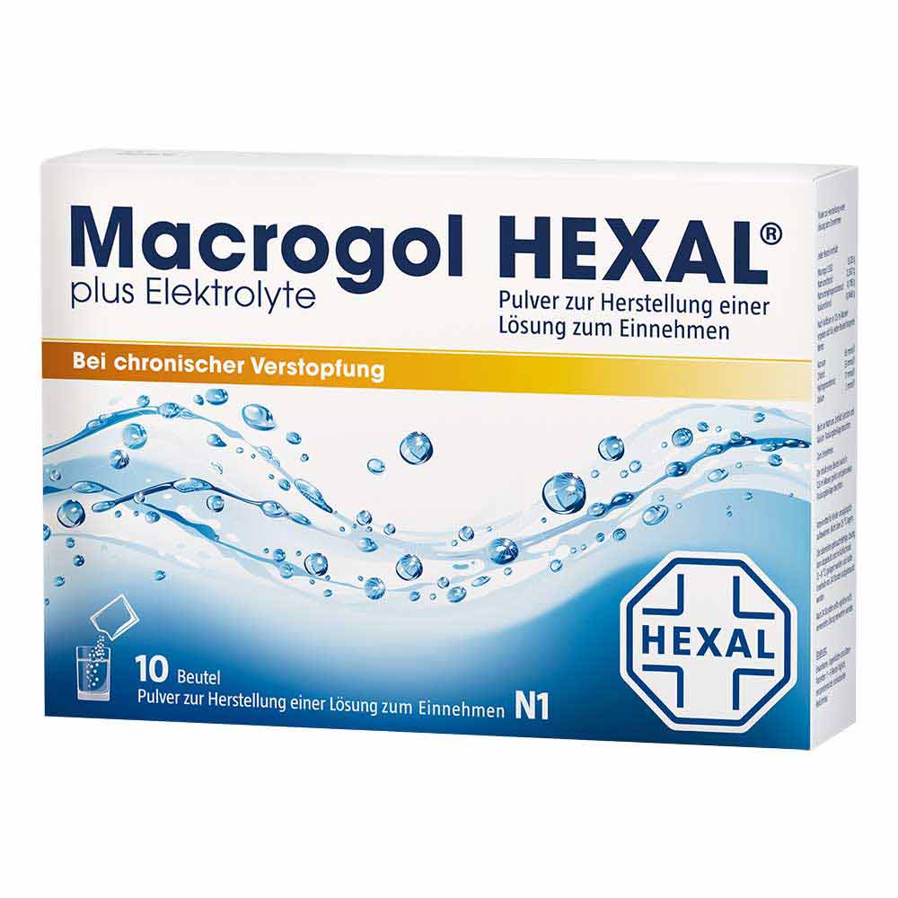 Macrogol HEXAL® plus Elektrolyte Pulver zur Herstellung einer Lösung zum Einnehmen, Wirkstoffe: Macrogol 3350, Natriumchlorid, Natriumhydrogencarbonat, Kaliumchlorid. Anwendungsgebiet: Zur Behandlung von Verstopfung (insbesondere bei länger anhaltender Verstopfung) bei Erwachsenen, Jugendlichen und älteren Patienten. Die Anwendung bei Kindern unter 12 Jahren wird nicht empfohlen. Enthält Natrium, Sorbitol und Kalium. Zu Risiken und Nebenwirkungen lesen Sie die Packungsbeilage und fragen Sie Ihre Ärztin, Ihren Arzt oder in Ihrer Apotheke! Mat.-Nr.: 2/51014788-02 Stand: November 2021 Hexal AG, 83607 Holzkirchen, www.hexal.de