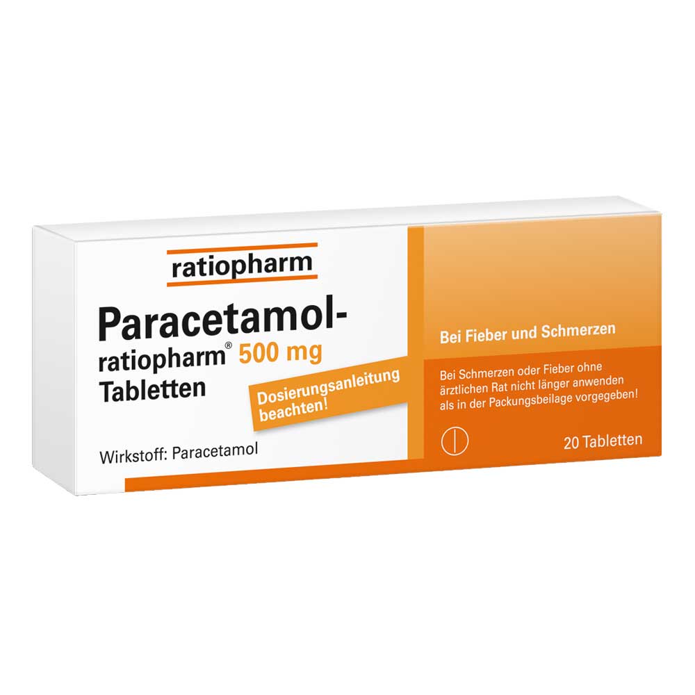 Paracetamol-ratiopharm® 500 mg Tabletten. Wirkstoff: Paracetamol.. Anwendungsgebiete: Leichte bis mäßig starke Schmerzen. Fieber. Warnhinw.: Bei Schmerzen oder Fieber ohne ärztlichen Rat nicht länger anwenden als in der Packungsbeilage vorgegeben! AM enth. weniger als 1 mmol (23 mg) Natrium pro Tbl., d. h. es ist nahezu „natriumfrei“. Apothekenpflichtig. Zu Risiken und Nebenwirkungen lesen Sie die Packungsbeilage und fragen Sie Ihre Ärztin, Ihren Arzt oder in Ihrer Apotheke. 12/24