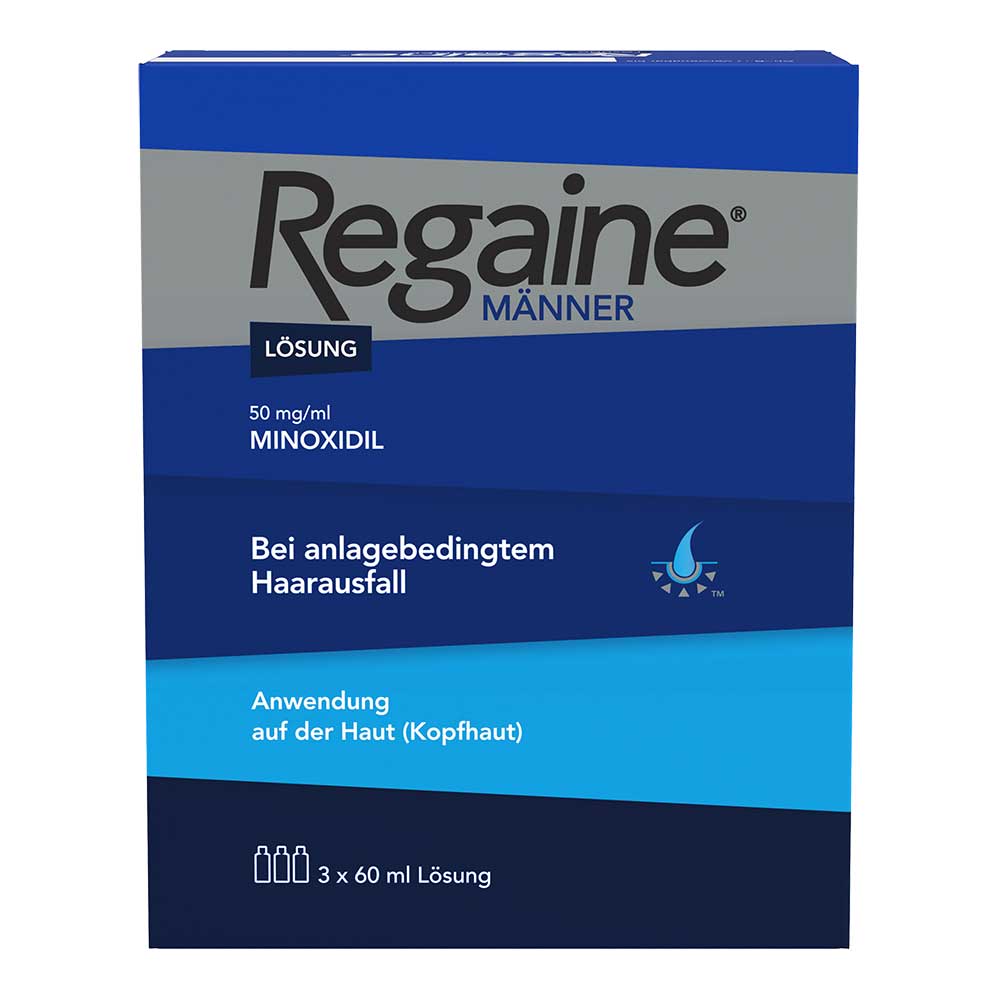 Dank des Wirkstoffes Minoxidil in 5 %-iger Konzentration kann Regaine® Männer Lösung erblich bedingtem Haarausfall entgegenwirken. Minoxidil erweitert die Blutgefäße und regt die Blut- und Nährstoffversorgung der Haare an. Wissenschaftliche Studien und 90 % der Verwender haben die Wirksamkeit von Regaine® Männer Lösung bestätigt (Befragung von 7.424 Männern zur Wirksamkeit von Regaine® nach 12 Monaten).