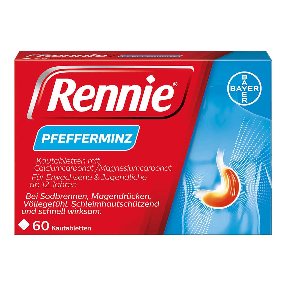 Rennie® Wirkstoffe: Calciumcarbonat/ schweres, basisches Magnesiumcarbonat. Zur symptomatischen Behandlung von Erkrankungen, bei denen die Magensäure gebunden werden soll, wie z. B.: Sodbrennen und säurebedingte Magenbeschwerden; Magen- und Zwölffingerdarmgeschwüre (Ulcus ventriculi oder Ulcus duodeni). Warnhinweis: Enthält Sucrose (Zucker). Stand: 01/2024. Bayer Vital GmbH, 51368 Leverkusen, Deutschland. Zu Risiken und Nebenwirkungen lesen Sie die Packungsbeilage und fragen Sie Ihre Ärztin, Ihren Arzt oder in Ihrer Apotheke.