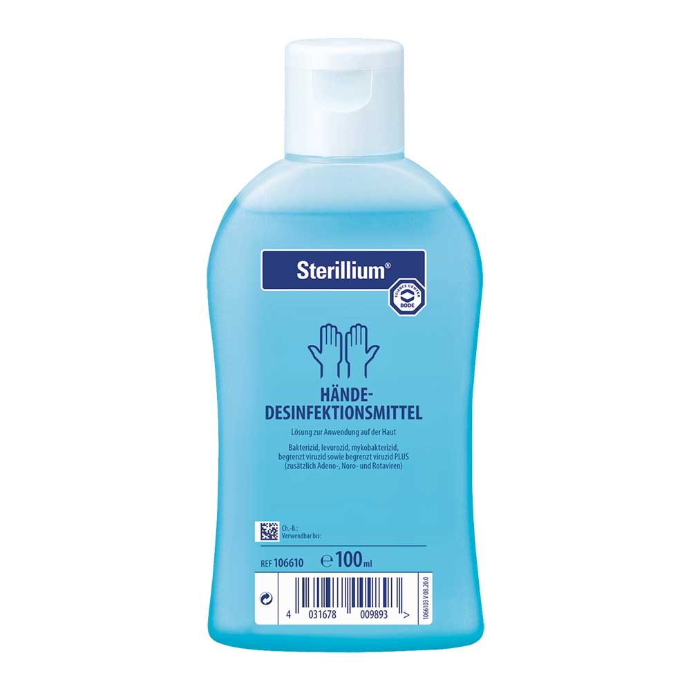 Sterillium®. Wirkstoffe: Propan-2-ol, Propan-1-ol, Mecetroniumetilsulfat. Anwendungsgebiete: Zur hygienischen und chirurgischen Händedesinfektion. Zur Hautdesinfektion vor Injektionen und Punktionen. Warnhinweise: Sterillium® soll nicht bei Neu- und Frühgeborenen angewendet werden. Erst nach Auftrocknung elektrische Geräte benutzen. Nicht in Kontakt mit offenen Flammen bringen. Auch nicht in der Nähe von Zündquellen verwenden. Flammpunkt 23 °C, entzündlich. Bei bestimmungsgemäßer Verwendung des Präparates ist mit Brand- und Explosionsgefahren nicht zu rechnen. Nach Verschütten des Desinfektionsmittels sind folgende Maßnahmen zu treffen: sofortiges Aufnehmen der Flüssigkeit, Verdünnen mit viel Wasser, Lüften des Raumes sowie das Beseitigen von Zündquellen. Nicht rauchen. Im Brandfall mit Wasser, Löschpulver, Schaum oder CO2 löschen. Ein etwaiges Umfüllen darf nur unter aseptischen Bedingungen (Sterilbank) erfolgen. Zu Risiken und Nebenwirkungen lesen Sie die Packungsbeilage und fragen Sie Ihre Ärztin, Ihren Arzt oder in Ihrer Apotheke. BODE Chemie GmbH, Melanchthonstraße 27, 22525 Hamburg